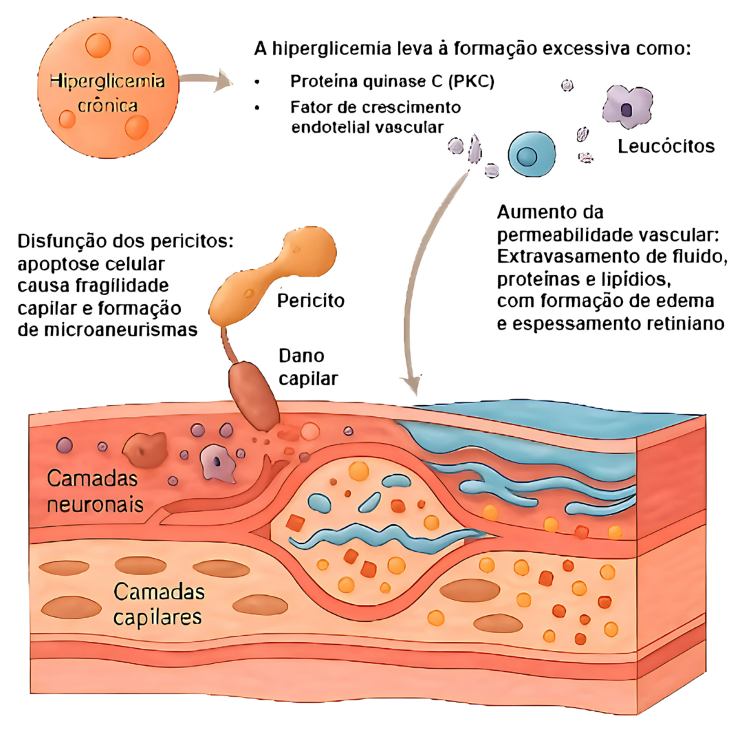 O acúmulo de líquido no centro da retina (mácula), devido ao aumento da permeabilidade vascular, causa edema macular, que pode levar à baixa acuidade visual e à distorção.